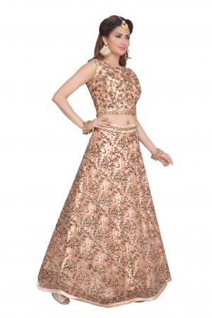 Peach Printed Lehenga with Navy Nlue Long Blouse